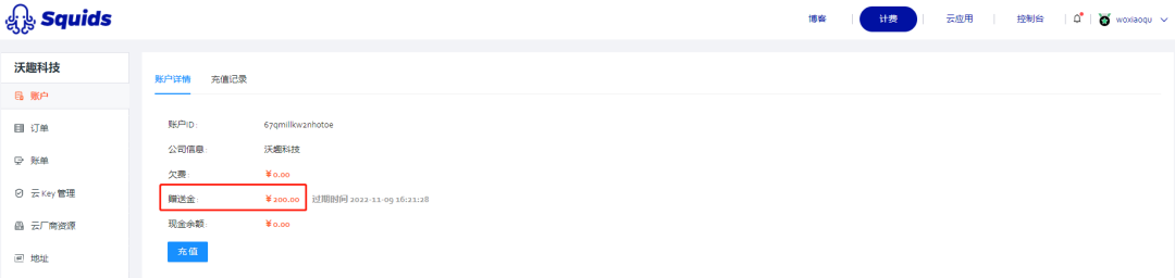 新用户,注册即得体验金;老用户,登录即得体验金。可在图中位置查询详情(注册登录-计费-账户-账户详情)。