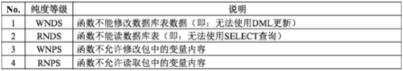 如果在包中定义了函数,那么可以直接通过SQL语句进行调用,如果现在要对包中的函数进行限制 ,例如:不能包含DML语句,如果要设置包的纯度级别可以使用如下语法完成: