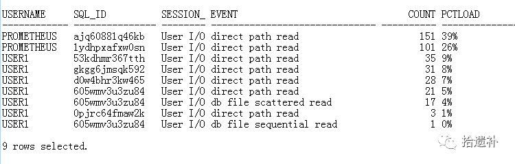 由于这两个语句为每天执行的报表查询,平日表现虽慢但还算乖巧,所以分析问题应该不在这两个语句上,同时发现有大量Prometheus的监控语句正在执行,等待事件显示为direct path read,怀疑是全表扫描,进一步查询发现监控的渠道为昨日新上线内容,故认定入口就在这里。