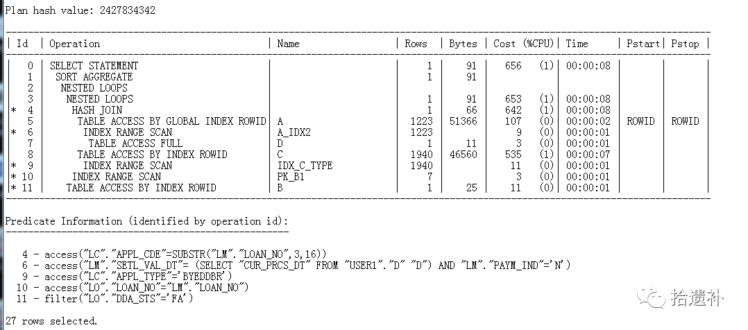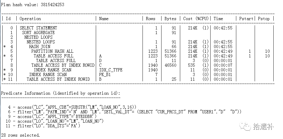通过SQL_ID查询语句执行计划,发现语句主表果然是全表扫描,产生COST值*[并非准确值]惊人。