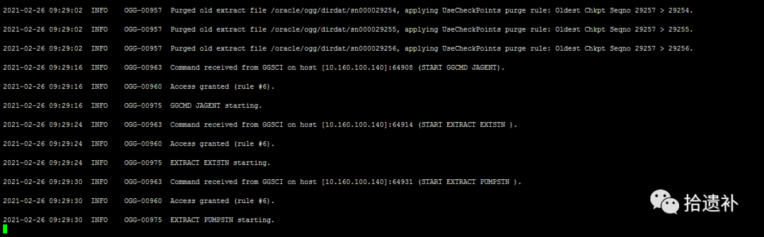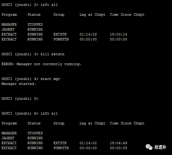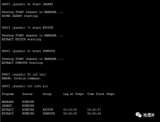 5. 最主要的步骤已经完成了,接下来就是把其他难兄难弟们都拉起来,启动后Info all查看进程状态,诸位各司其职,OGG恢复正常。