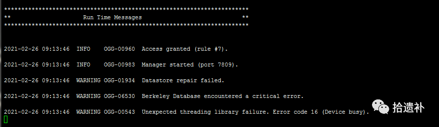 打开MGR进程Report报告,Warning三兄弟洋洋得意的向我招手:OGG-01934 Datastore repair failed.OGG-06530 Berkeley Database encountered a critical error.OGG-00543 Unexpected threading library failure. Error code 16