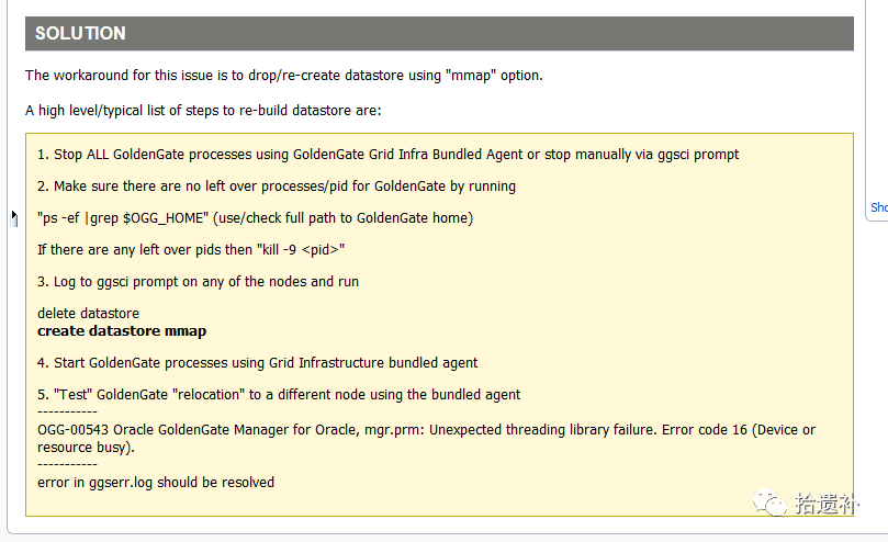 说到这个问题可真算是“老朋友”了,当年第一次出现的时候,让我如芒刺背,至今记忆犹新。网络上对于OGG问题的分享少之又少,翻烂了百度,找遍了Google之后,最后是在MOS里找到了解决之道。这个问题记录在 (Doc ID 2149151.1) OGG-00543 Unexpected Threading Library Failure. Error Code 16 (Device Or Resource Busy) 中,文中分析是由于OGG存放信息的Barkeley数据库出现了问题,由于数据库轻量,且无业务内容存放,故只需删除重建即可,给出的解决方案如下: