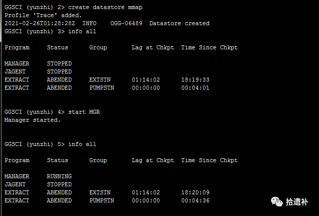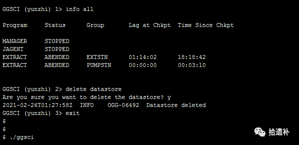 2. 杀掉进程后,GGSCI环境再次查看一下进程情况,全部关闭后(其实不关也没啥问题),我们动手删除Datastore。这里就出现了一个小点,当年这个点可也是卡了好一会:在删除Datastore后务必要退出GGSCI再次登录,这样才能刷新上下文,让后面的创建工作成功进行。