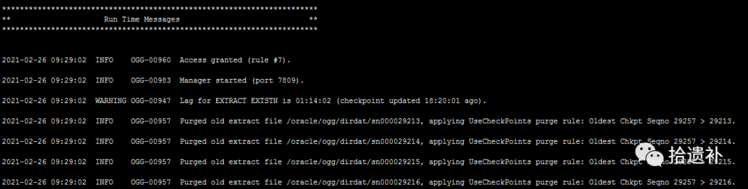 今早巡检告警显示OGG出现异常,源端抽取进程延迟时间将近20小时,一种不详的预感漫上心头。首先得到怀疑的是系统存放dump文件的目录满了,满了之后抽取进程会Hang着等待,直到放置文件的目录出现可用空间。查看了目录才占用68%,显然不是这个原因。那会不会是EXTSTN进程假死了呢?重启EXTSTN进程发现端倪,原来是MGR管理进程宕掉了。那就重启MGR进程呗,嚯,一动不动,妥了,大活儿来了。