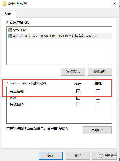 选择 SAM 项 ,在工具栏上的 “编辑 > 权限” 中设置权限 ,将 Administrators组 的权限设置为完全控制 后保存。