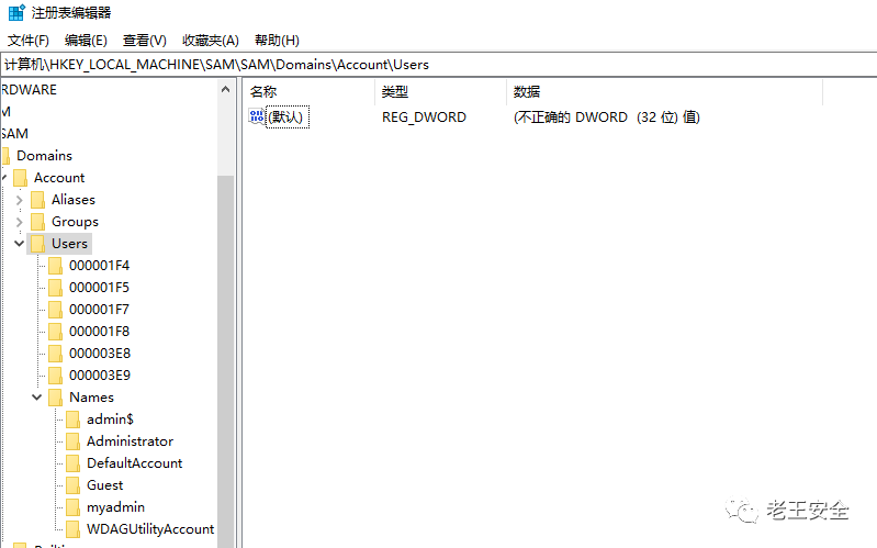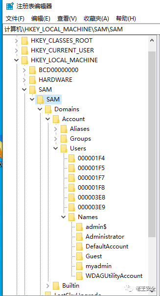 设置好后,回到注册表主页面 ,发现SAM项下出现了隐藏的子项,找到 SAM > Domains > Account > Users 和 Names
