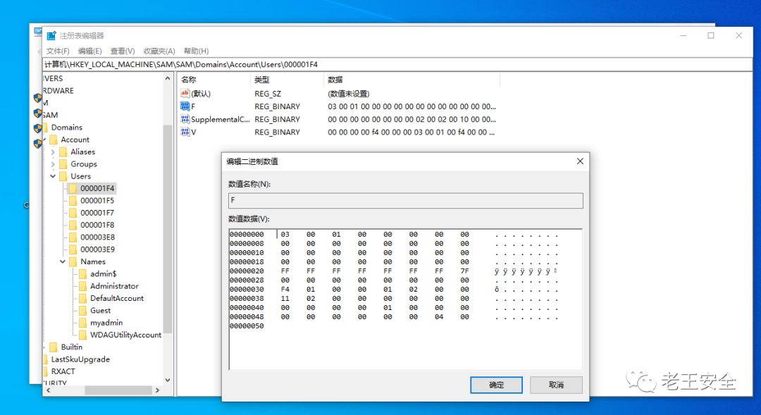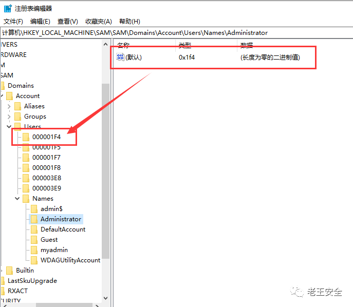 Administrator用户的F值(0x1f4为SID=500的账户):