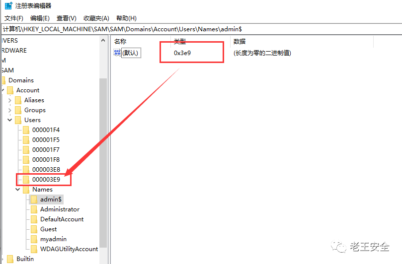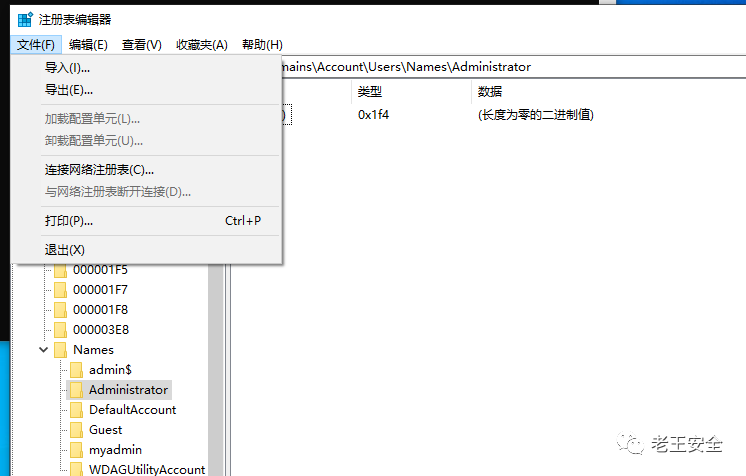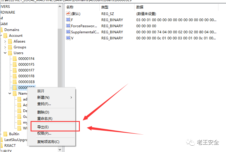 将Users项下的000003E9项(admin$用户的SID二进制数据值)下的值替换成Administrator用户的值,替换后导出 Names项 下的 admin$项 与 000003E9项(右键选择项进行导出) 。