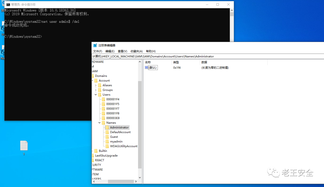 利用cmdshell(管理员权限)将admin$删除,删除后发现注册表中的admin$用户相关项已经消失,这时候我们导入已经备份好的项与数值(导出后双击进行导入或者在注册表中导入)