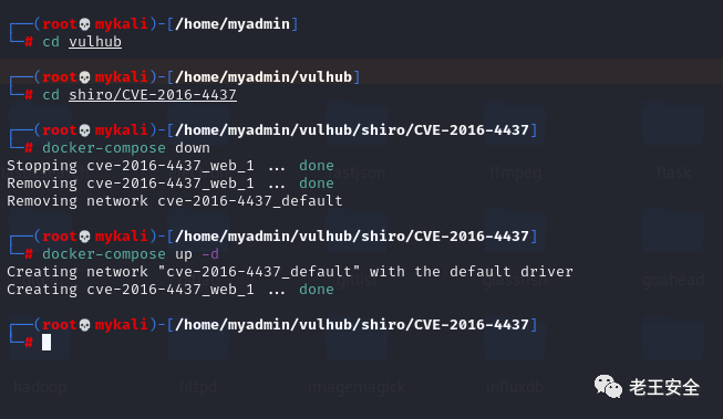 1 实验环境:Linux下的docker与docker-compose2 vulhub github地址:https://github.com/vulhub/vulhub34 拉取vulhub:5 git clone https://github.com/vulhub/vulhub #如果出现4xx错误,请改为git clone git://github.com/vulhub/vulhub67 命令:8 docker-compose up -d#在漏洞目录shiro 550(CVE-2016-4437)拉取启动docker容器,启动关闭docker需要在同一9 docker-compose down#关闭docker容器