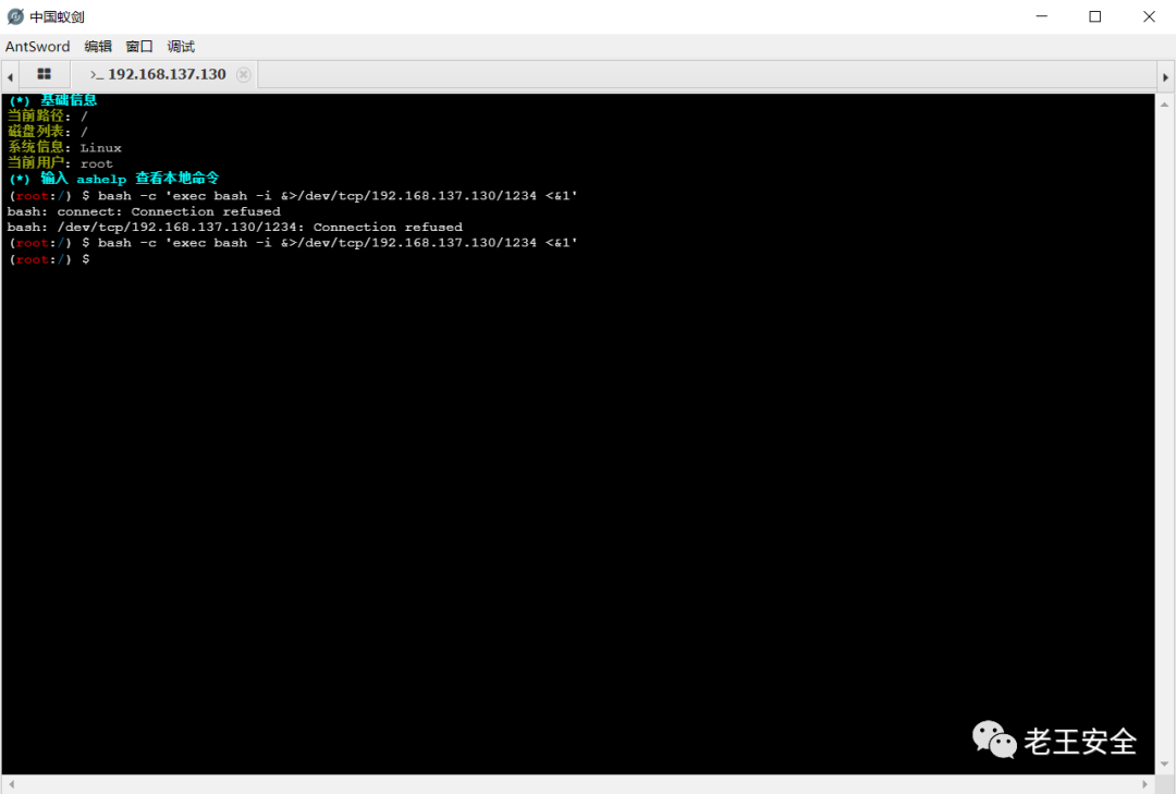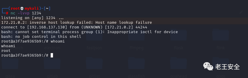 利用虚拟终端,尝试反弹shell到攻击机Kali上(正常状态下应该是公网VPS)