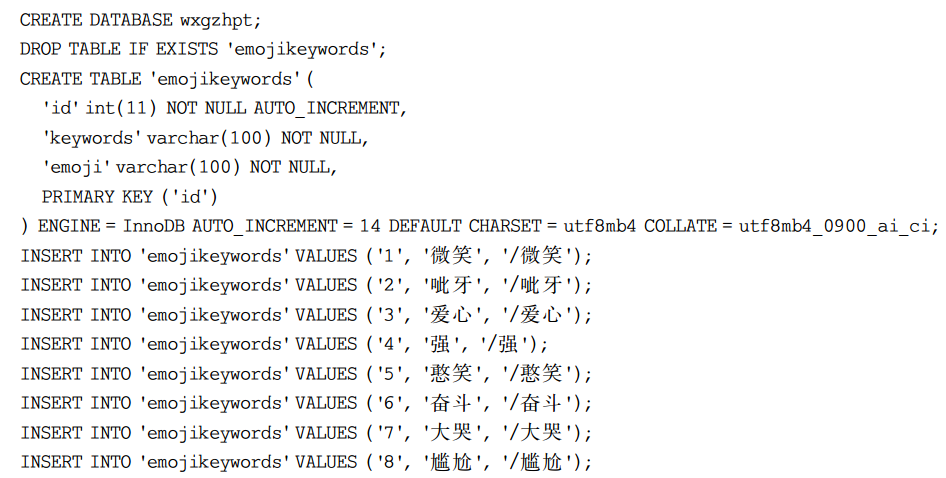 需要先安装数据库MySQL并创建数据库wxgzhpt,并创建表、插入数据,SQL语句代码如例1所示。