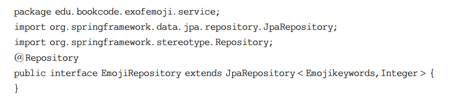 在包edu.bookcode.exofemoji.service中创建接口EmojiRepository,代码如例4所示。
