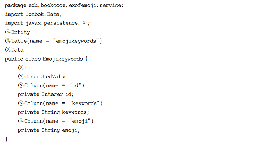 在包edu.bookcode中创建exofemoji子包,并在包edu.bookcode.exofemoji中创建service子包,在包edu.bookcode.exofemoji.service中创建类Emojikeywords,代码如例3所示。