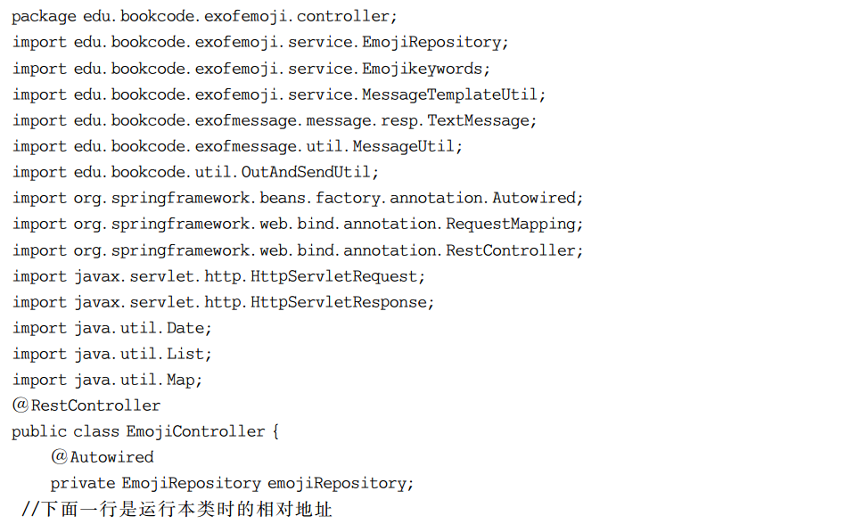 在包edu.bookcode.exofemoji中创建controller子包,并在包edu.bookcode.exofemoji.controller中创建类EmojiController,代码如例6所示。