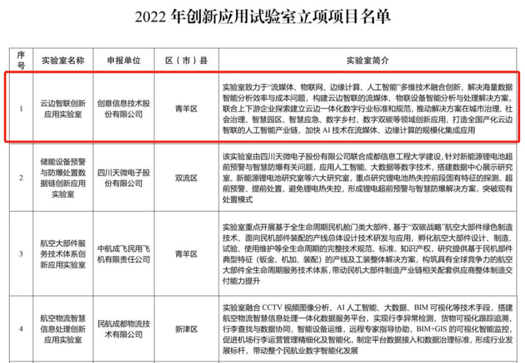 近日,成都市新经济发展委员会发布了《2022年创新应用实验室立项项目名单》,创意信息“云边智联创新应用实验室”成功入选。