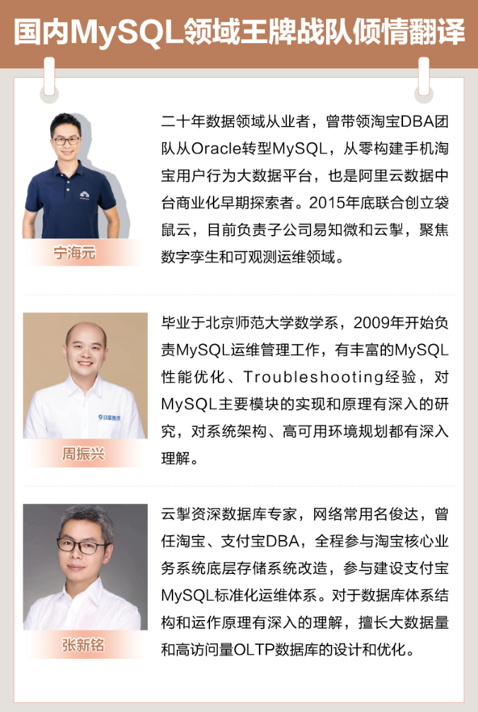 也希望你从书中新发现的见解,可以帮助你学习和实践一种系统的方法,用来设计、维护和检测基于 MySQL 的系统架构。
