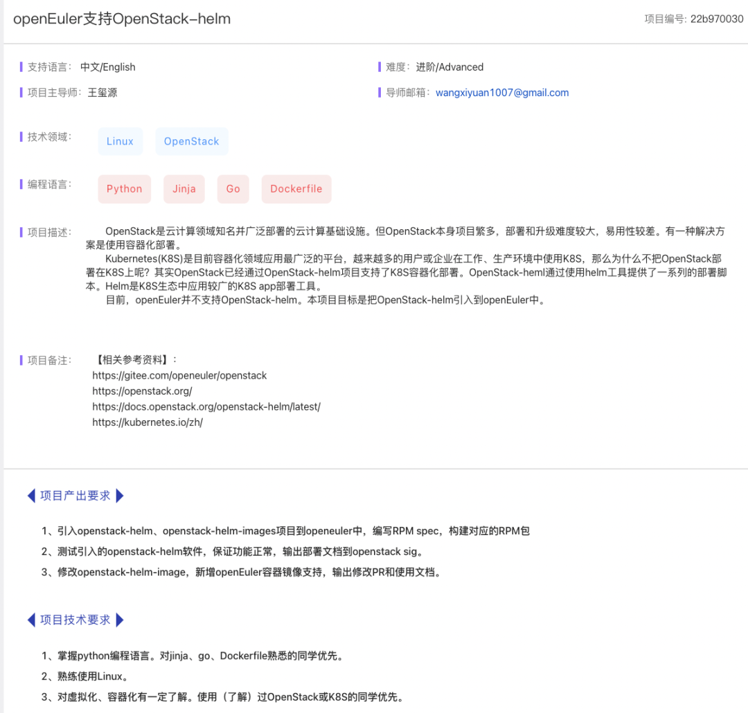 本次我参加开源之夏的项目是出自 openEuler 社区的【openEuler支持OpenStack-helm】。该项目的主要内容是对 OpenStack-Helm 完成适配和打包,最终发布能直接被用户使用的软件包。在项目中我完成了适配打包工作,并制作了一个简易的脚本来辅助用户完成安装部署操作。
