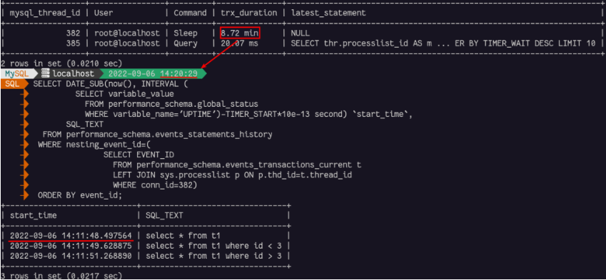 我已经有一个MySQL Shell插件允许找到当前事务并按时间进行排序。该插件还允许你获得所需事务的详细信息。详情可看check.getRunningStatements().