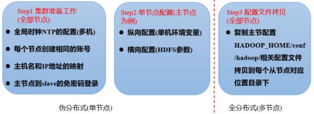 (1)集群的准备工作, 涉及全部节点。分别是:集群的全局时钟配置,账号和权限和节点存储路径,配置主机名和IP地址的映射,主节点到所有从节点的免密码登录。