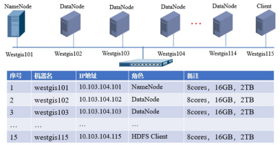 图1-4描述了集群的规划示意图,在该规划中待配置的HDFS集群有15个节点,每个节点的配置均为(8个core,16GB内存,2TB磁盘空间);每个节点的机器名分别为westgis101~westgis115,IP地址为10.103.104.101~115;其中westgis101为集群的NameNode,westgis102~ westgis114等13个节点为DataNode节点,westgis115为Client角色。