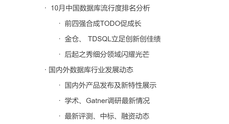 10月《中国数据库行业分析报告》已正式发布(点击即可跳转,欢迎大家下载查阅),本期报告介绍了墨天轮“中国数据库流行度排行”、国内外产品发布、评测以及国内厂商中标与投融资最新情况,由此展现当前数据库市场发展前沿动态。