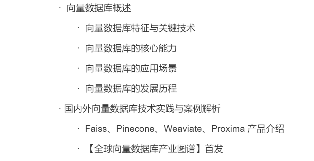 报告展示了 Faiss、Pinecone、Weaviate、Proxima 等向量数据库、向量搜索引擎等向量化技术相关产品的架构与功能特性,便于帮助大家更好地了解向量数据库及其相关技术的核心原理与应用发展轨迹,此处仅展示其中部分内容,查阅报告可了解更多。