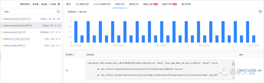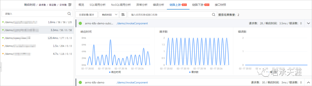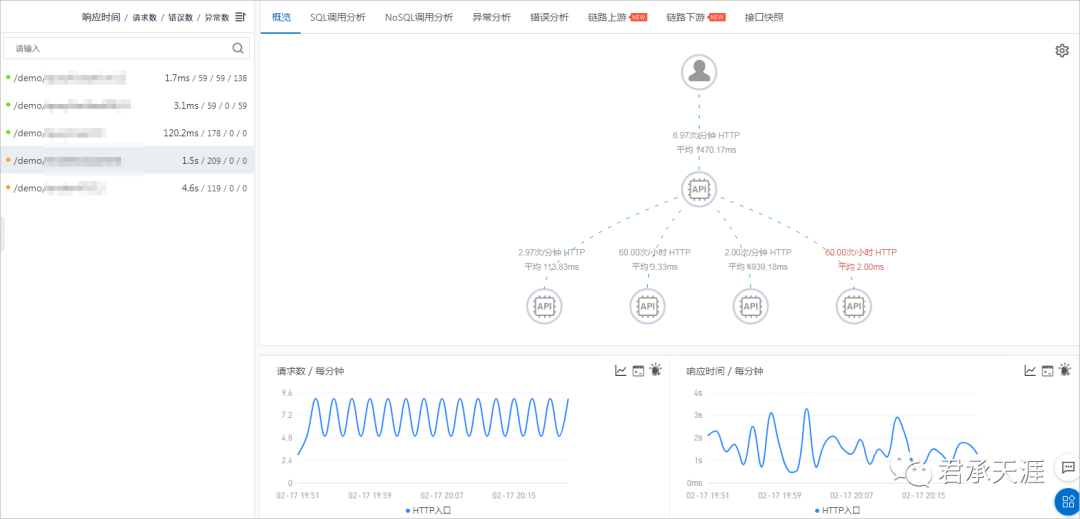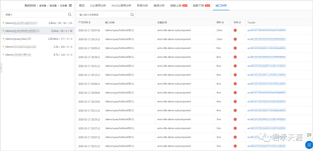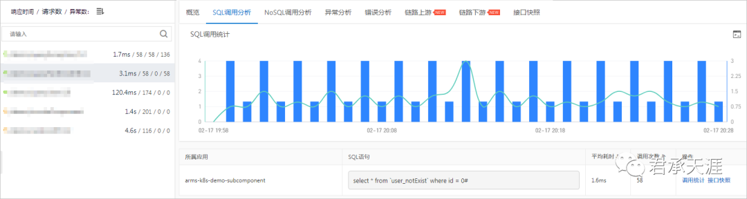 用于监控应用下的接口调用详情,包括SQL调用分析、NoSQL调用分析、异常分析、错误分析、链路上下游和接口快照。