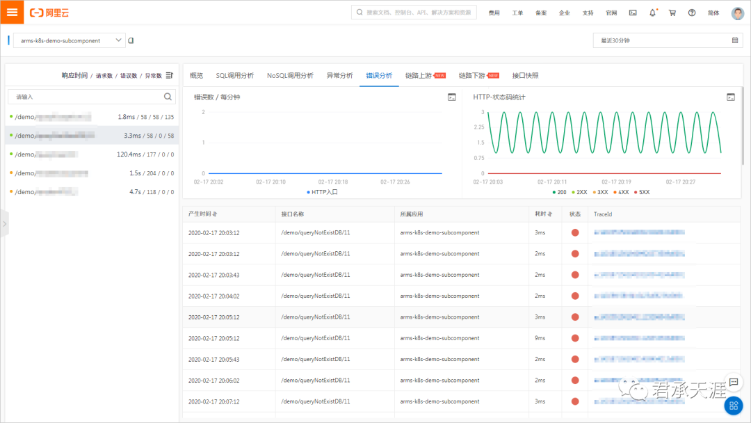 在错误分析页签展示了应用的错误和HTTP状态码统计数据。您还可以单击需要查看的TraceId,即可在新页面查看调用链路相关信息。