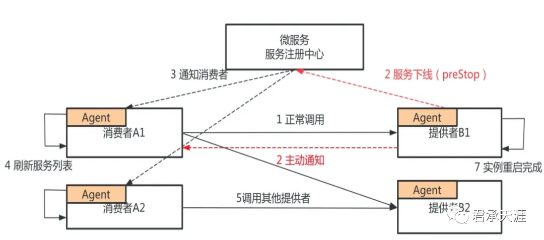 第一,服务提供者在应用发布前,会主动向服务注册中心注销应用,并将应用标记为已下线状态,将原来停止进程阶段的注销变成了 preStop 阶段注销进程。