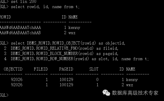 然后就可以查看插入的记录的ROWID,从而确定插入数据在物理磁盘上的位置: