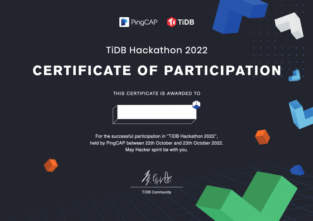 决赛将于 10 月 22 日至 10 月 23 日在上海、北京、广州、成都、新加坡等地的 PingCAP 公司举行,请入围选手 10 月 22 日上午 9:00-10:00 到达决赛现场,签到并领取参赛礼品,决赛详细流程参见参赛须知(点击文末【阅读原文】直达)。其他提交 RFC 的赛队也将获得本次活动的电子参赛证书(将发放给到队长),也欢迎大家线上围观决赛,并参与最佳人气项目的投票,参与投票的小伙伴还有机会抽取礼品哟!