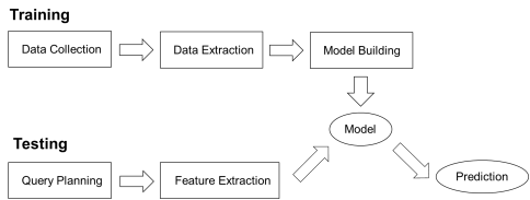 训练阶段:Data Collection模块执行作为训练集的语句,Data Extraction模块收集执行的语句特征及执行时间,包括执行计划及算子级别的信息。Model Building模块基于计划级别特征与算子级别信息分别训练SVM模型,再将两模型通过误差分布结合,生成最终的预测模型。这主要是考虑到计划级别信息具有普适性,而算子级别信息具有更高的精确性,结合两者可以在保持具有普适性的前提下,尽可能地精确预测。