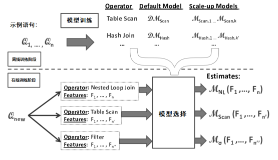 离线训练阶段:针对数据库每种类型的算子(如Table Scan,Merge Join,Sort...),分别训练其对应的模型,用于估算此算子的开销。此外,使用单独的训练阶段,可为不同的算子选择适当的缩放函数。最后,形成带缩放函数的不同的回归树模型。