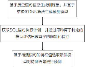 (3) 在预测过程中,首先判断是否存在模型,如果模型不存在,则直接报错退出;如果存在模型,则导入模型,并利用word2vector算法将待预测的SQL语句进行向量化,并将该向量输入到深度学习网络中,获取该神经网络的最后一个全连接层的输出结果,即为该SQL语句的特征向量。最后,利用余弦相似度在样本数据集中进行寻找,找到相似度最高的SQL语句,将该结果返回即为该待预测SQL语句的预估执行时间。当然,如果是基于最新SQL语句执行时间数据集训练出的深度学习模型,则模型的回归预测结果也可以作为预估执行时间。