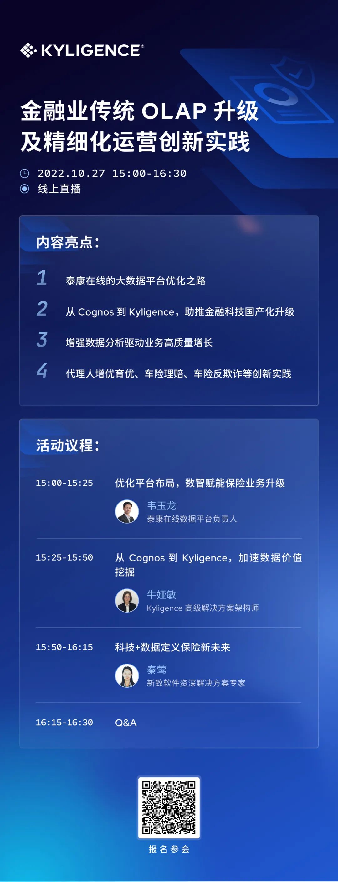 Kyligence 将于10月27日举办网络研讨会,以升级 Cognos 应用为例,从行业实践、业务需求、产品方案等视角一起探索 OLAP 升级最佳实践。本次研讨会邀请了泰康在线的数据平台负责人韦玉龙分享平台建设过程中如何通过产品、技术增强来帮助企业业务升级;其次,Kyligence 解决方案专家牛娅敏将深度剖析从 Cognos 架构到 Kyligence 架构的升级及能力提升;同时,我们更特邀了新致软件金融行业的解决方案专家秦莺,带来以科技+数据驱动的保险场景解决方案。