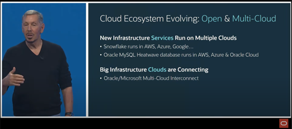 甲骨文公司董事会主席兼首席技术官 Larry Ellison 首先为我们介绍了开放式的多云基础架构战略。虽然三年不见,但 Larry 的状态似乎比之前更加神采奕奕。现在大多数客户都早已开始使用多云战略,很多企业都会使用 2 家以上的云服务商所提供的基础架构,这些客户与更多的 SaaS 云提供商合作,使用他们所提供的专业化服务。