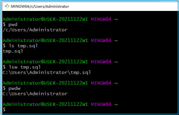 在 Windows 的 Git Bash 环境下 Windows 下的路径会自动转换成 Linux 下的格式。比如执行 pwd 显示当前路径,shell 环境下的输出为: