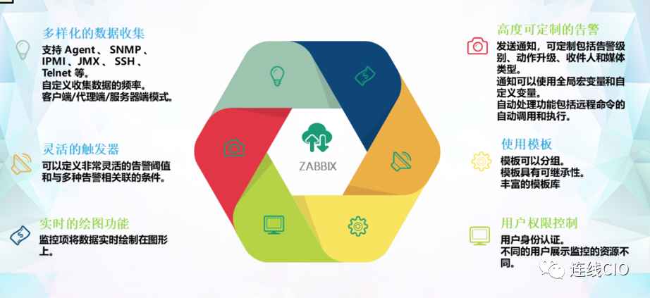 Zabbix是一个开源的、基于WEB界面的、提供分布式系统监控的解决方案,可以对服务器、虚拟机、存储、交换机、路由器、无线AP、数据库、中间件、应用软件系统等进行监控报警,支持SNMP、探针、API、第三方接口等方式提供对远程服务器/网络状态进行监控,发现隐患并报警。