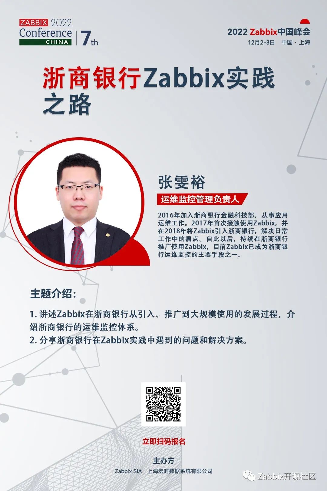浙商银行的运维监控管理负责人张雯裕先生将在峰会上详细分享! 诚邀您来12月2日第10届Zabbix中国峰会交流!扫码报名。