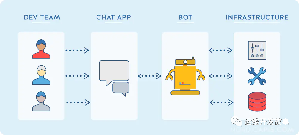 ChatOps 的核心在于把 WEB 端或者命令行下的人工操作,转换能通过聊天工具机器人来完成,所以整体的架构并不会很复杂,如下: