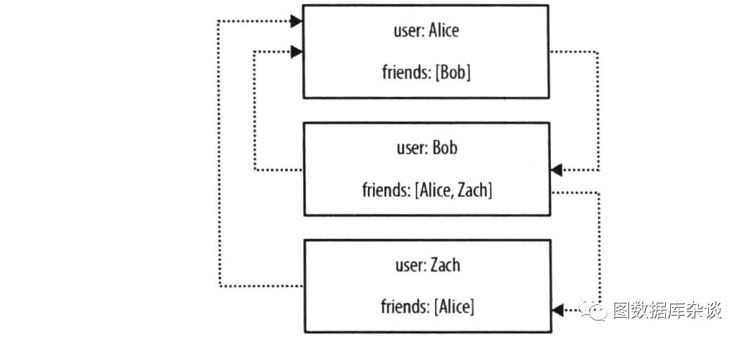 图四是一个基于文档实现的聚合存储的小型社交网络。通过这种结构,我们可以很明显的找到用户的直接朋友(查询Bob的朋友),不需要进行全表扫描。但是当我们回到 "Bob是谁的朋友"这样的问题时,就必须要进行全表扫描。当然我们可以通过添加属性friend_by,来表示入度关系(friends表示出度关系),但是这样又增加了数据维护成本和存储成本。