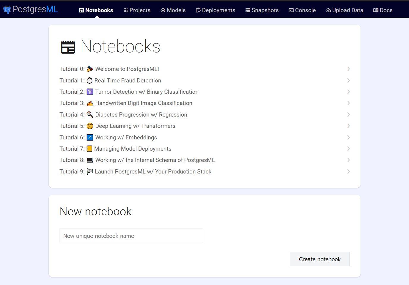 仪表板应用程序位于https://localhost:8000。您可以使用它在 Jupyter 风格的笔记本中编写实验、管理项目以及可视化 PostgresML 使用的数据集。
