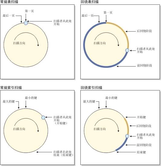 工作量繁重的扫描,例如对大型表进行的表扫描或多维集群 (MDC) 块索引扫描,有时适合与其他扫描共享页读。这样的共享扫描可以从表中的任意一点开始,以便利用已包含在缓冲池中的页。当共享扫描到达表的末尾时,它将从开头继续并在到达开始点时完成操作。这称为回绕扫描。图 1显示了表和索引的常规扫描与回绕扫描之间的区别。