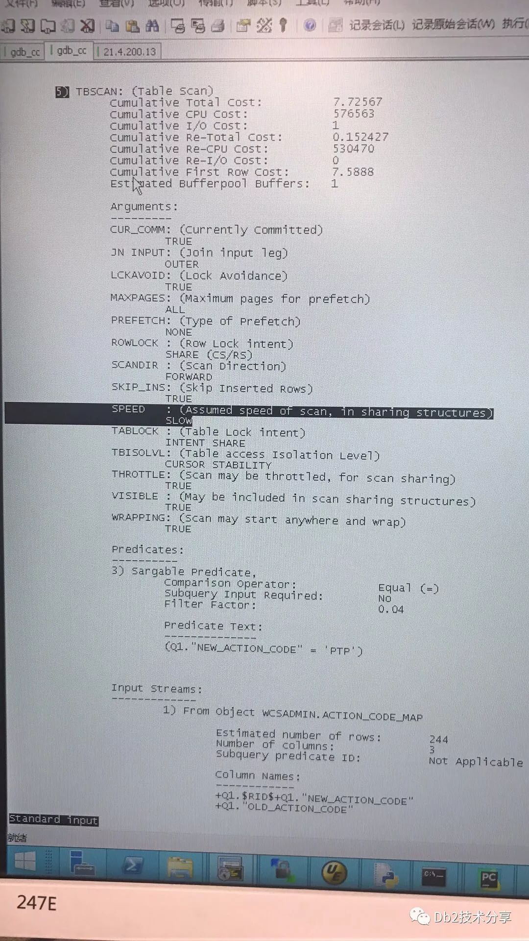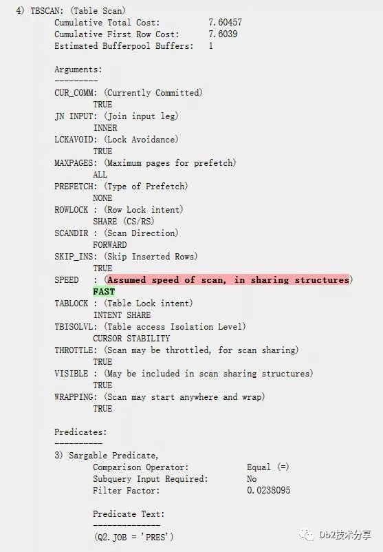 执行计划(这里我指的是db2exfmt的输出)中,你可能会发现操作TBSCAN或者FETCH中有SPEED指标,有时候它的值是SLOW, 有时候是FAST,下面我给出来两个例子。 文字较多,我直接贴图: