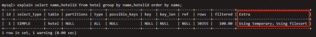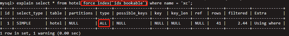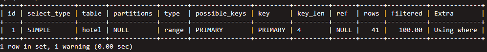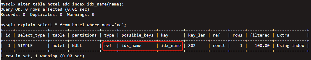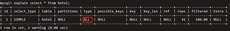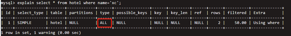 explain select * from hotel where hotelid=10000 and name='ctrip';