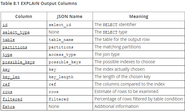 在SQL前面加上EXPLAIN,就可以查看执行计划,计划以“表”的形式展示: