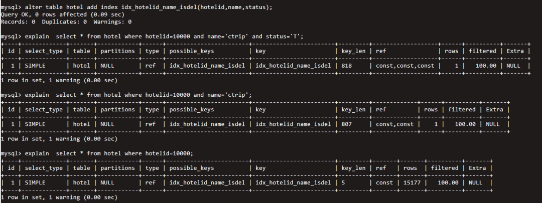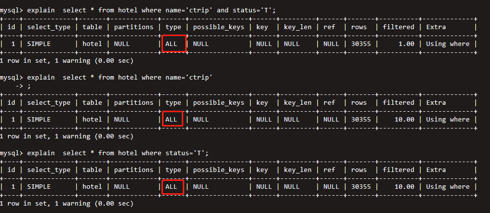 explain select * from hotel where hotelid=10000 and name='ctrip' and status='T';
